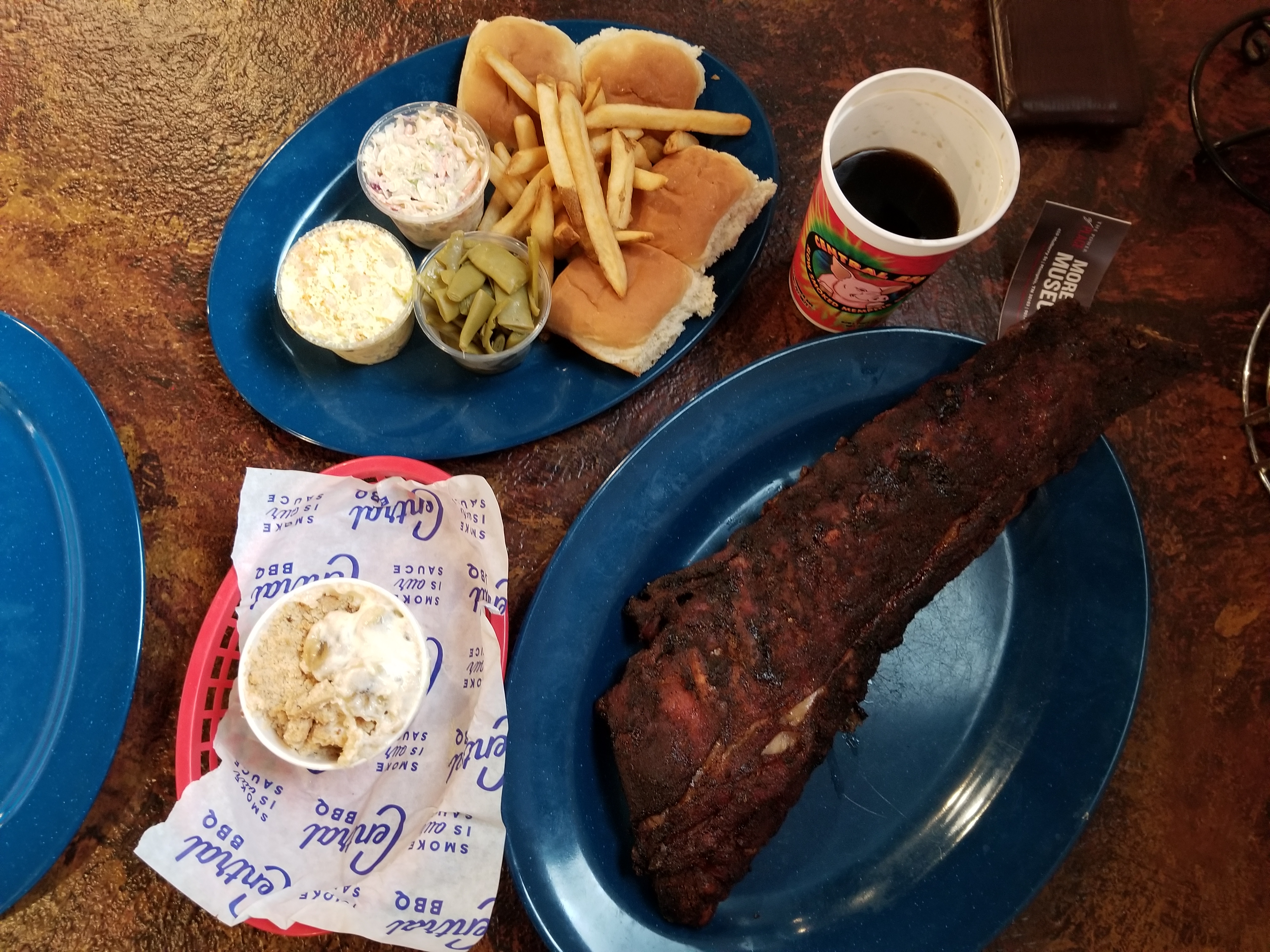 센트럴 비비큐(멤피스에 유명한 비비큐 집이 워낙 많지만) 이야기를 듣고 한번쯤 꼭 가보고 싶었다. 우리는 점저 애매한 시간에 갔더니 기다리지 않았다. 입구에서 미리 주문을 하고, 테이블 잡고 앉으면 된다. 우리는 Dry 립을 시켰다.(Wet 버전도 있었는데 한국에서 자주 먹는 손에 잘 묻는 양념 립이라 안 먹어본 Dry로 시킴) 사이드는 먹어보고 싶은 맛으로 여러개 시키고, 디저트로 바나나 푸딩도 시켰다.